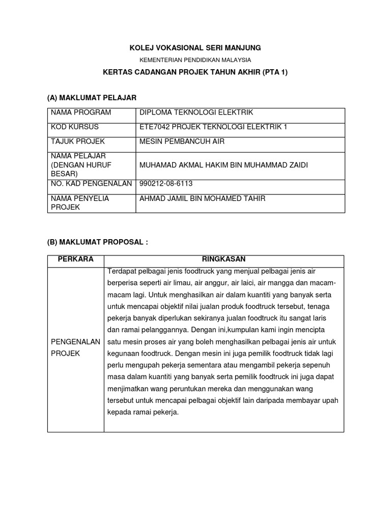 Related : Contoh Kertas Cadangan Projek Tahun Akhir - Kementerian pendidikan malaysia kertas cadangan projek tahun akhir (pta 1) (a) maklumat pelajar (diisi oleh pelajar) nama program kod kursus tajuk projek nama pelajar (dengan huruf besar) no..