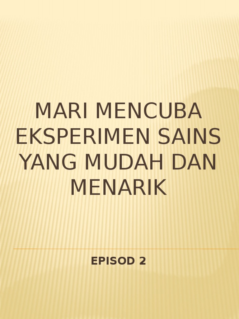 Baca lanjut tentang eksperimen yang membutuhkan latihan dan kesabaran. Eksperimen sains mengikut prinsip yang dipanggil kaedah saintifik yang memastikan ujian yang tepat dilakukan, keputusan yang dapat dipercayai dikumpulkan dan kesimpulan yang wajar diambil. View more presentations or upload your own. Belajar sains sekarang menjadi lebih mudah, kita bisa belajar sains melalui eksperimen / percobaan sains dimana saja dan kapan saja menggunakan kit sains. Ia juga mudah untuk difahami oleh pelajar.