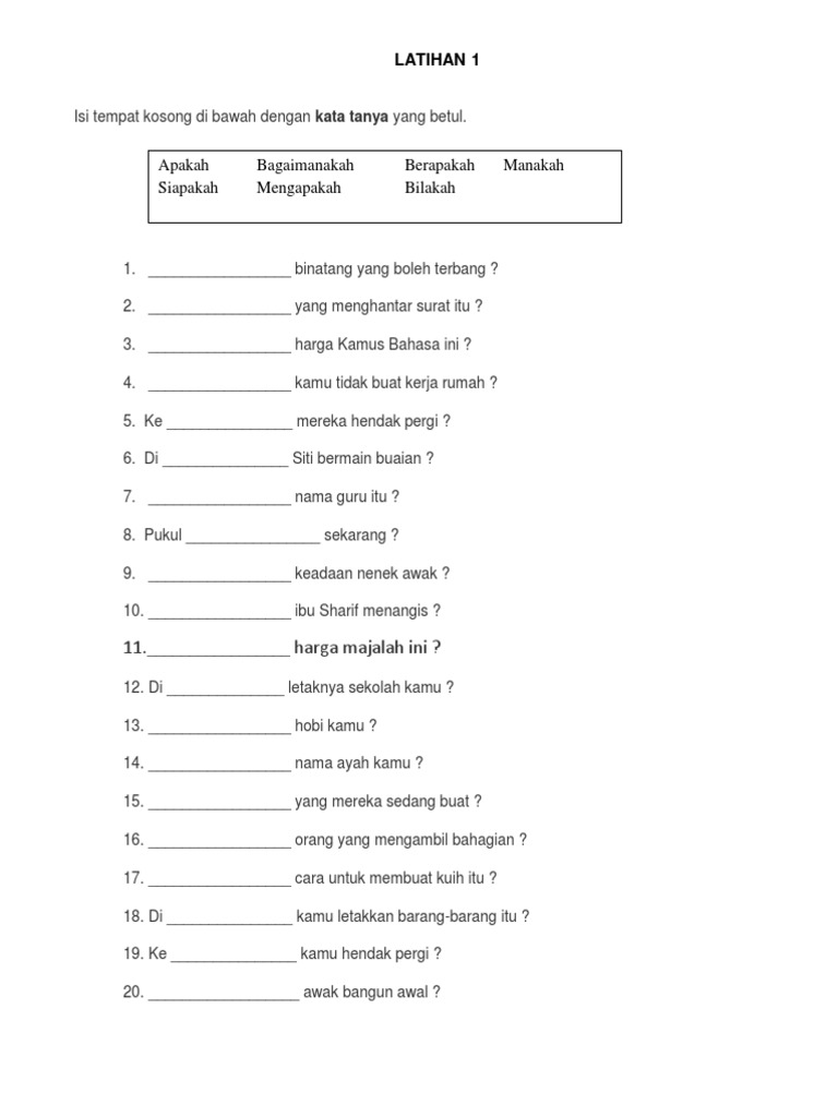 Kata Tanya Tahun 1 / You will be given 10 seconds per question.. Apakah nama tempat ini ? Jawaban atas kata tanya ini dapat berupa jam, hari, tanggal, bulan, tahun ataupun lamanya sebuah kejadian. Savesave latihan kata tanya tahun 1 for later. Untuk menantakan benda , binatang ,atau perkara contoh : Kata tanya boleh wujud di awal, di akhir atau di tengah ayat.